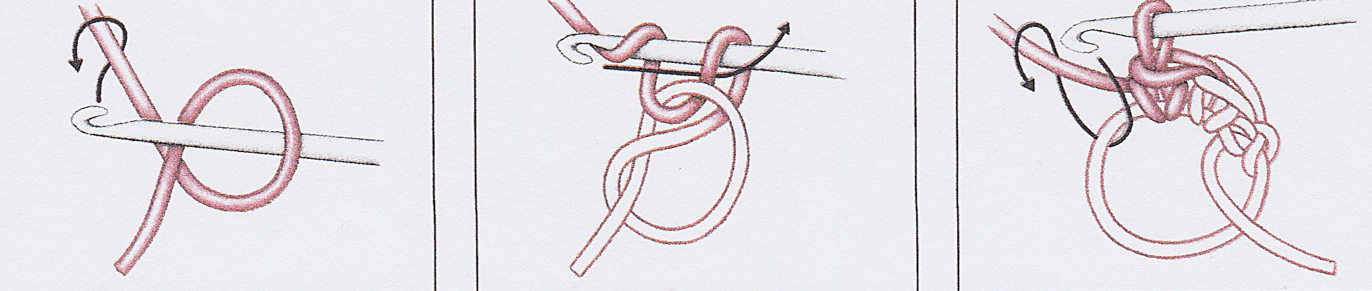 1.Z příze tvoříme smyčku, 2.Místo křížení přidržíme 3.Do kroužku v háčkujeme požadovaný