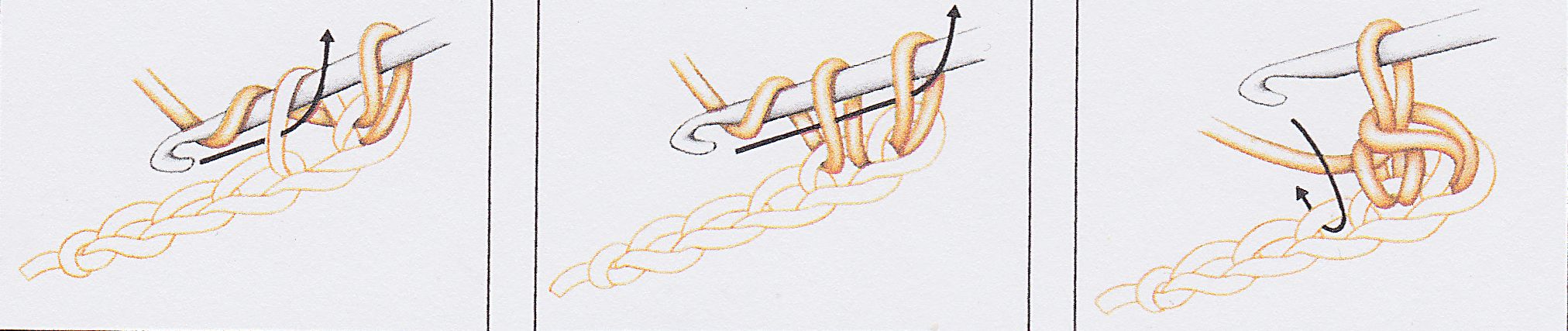 1.Vpíchneme do druhého 2.Opět nahodíme a přízi 3.Vpíchneme do následujícího