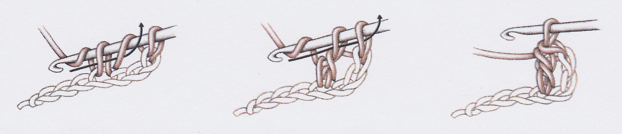 1.Uháčkujeme řetízek, přízi 2.Nahodíme ještě jednou a přízi 3.Nahodíme a vpíchneme do