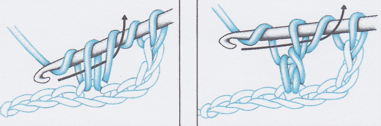 Na příkladu ukazujeme tři sloupky vpíchnuté do stejného oka, uháčkované ale vždy až po předposlední smyčku : nahodíme, vpíchneme do pátého oka od háčku, přízi nabereme dvěma smyčkami.Tak postupujeme ještě dvakrát.Všechny čtyři smyčky ležící na háčku sháčkujeme jedním nahozením a končíme jedním řetízkovým okem.